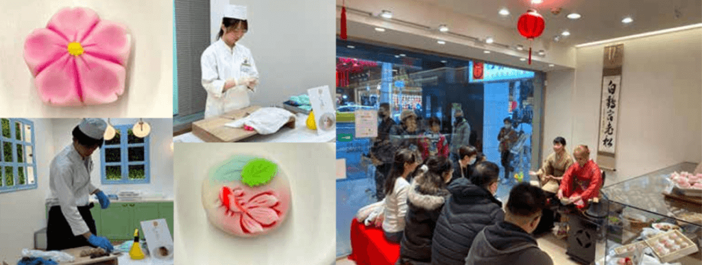 上生菓子的「生」有新鮮的,現做的含意,生菓子傳統由來即是一款在茶會,或正式活動場合 展現最高款待之心的點心,本次由本公司日本職人專程來台三天,現場演示上生菓子櫻花和金魚