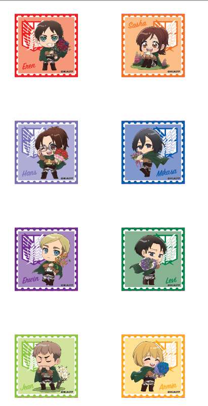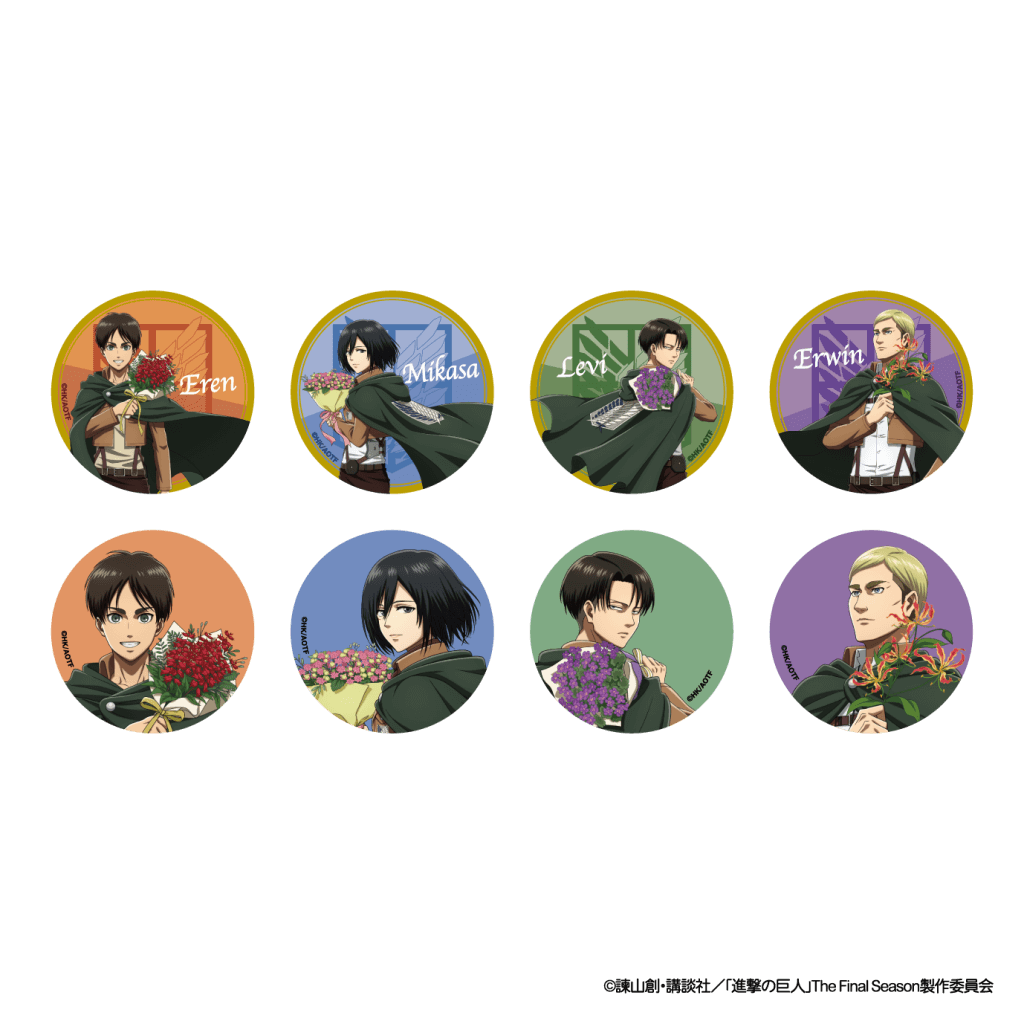 以全新繪製插畫登場的 艾連・葉卡、米卡莎・阿卡曼、里維・阿卡曼、艾爾文・史密斯 等角色,將化身為徽章、壓克力立牌等商品亮相。